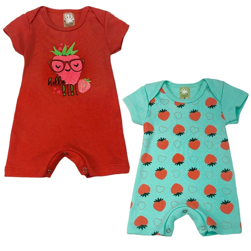 O kit macacão bebê menina moranguinho verde e laranja é composto por 2 macacões.